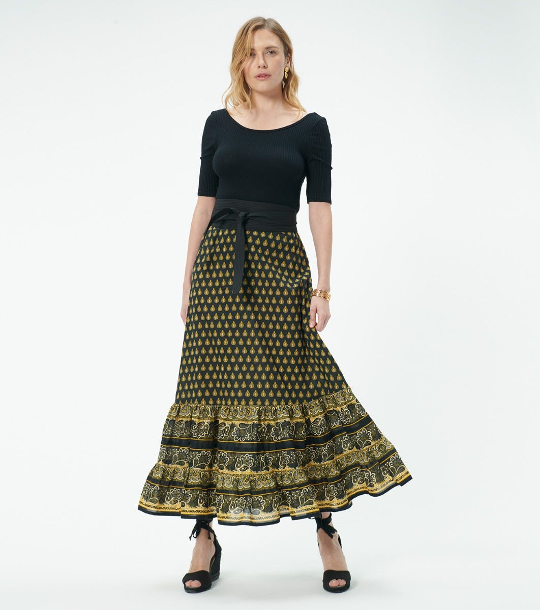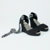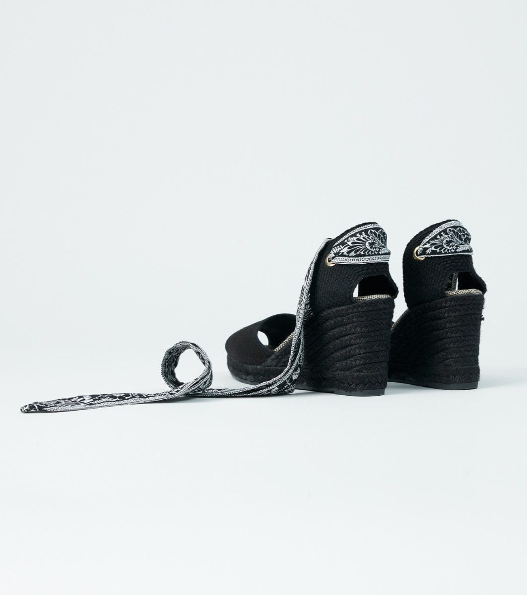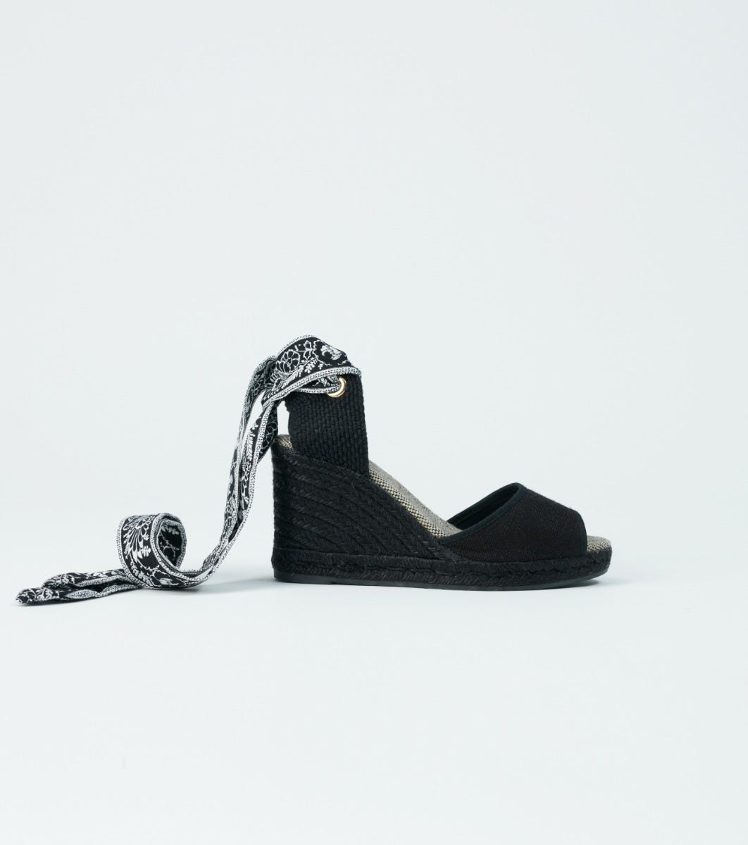 - Julina, our open-toe wedge espadrille with printed ribbon fastening to tie around the ankle. Resolutely feminine and timeless, this piece will match all your outfits, for an everyday or chic look, depending on your mood. Don’t hesitate to wear them with our iconic petticoats! The espadrille is also available with a plain black cotton strap for added versatility.