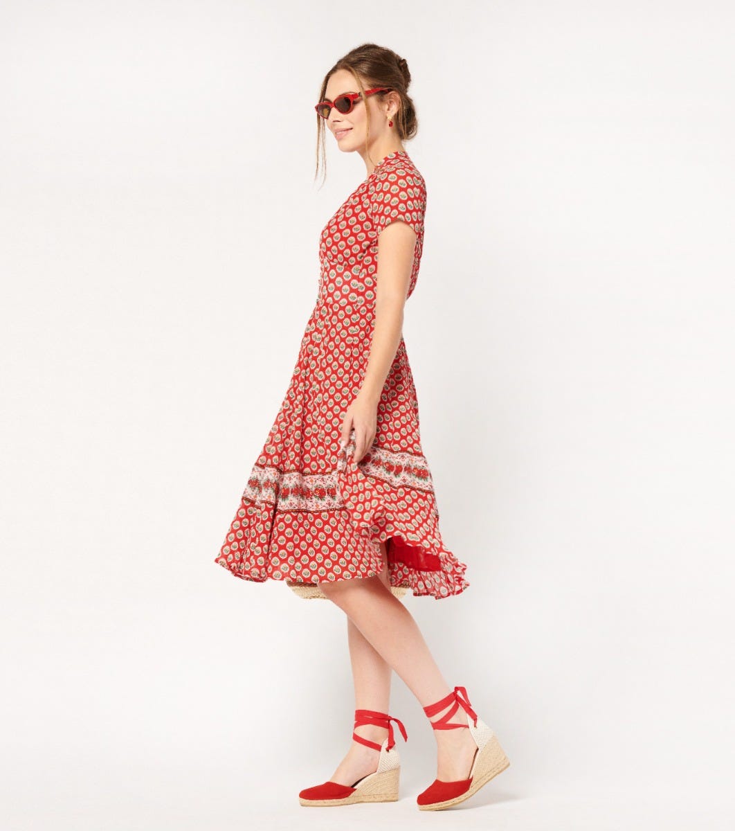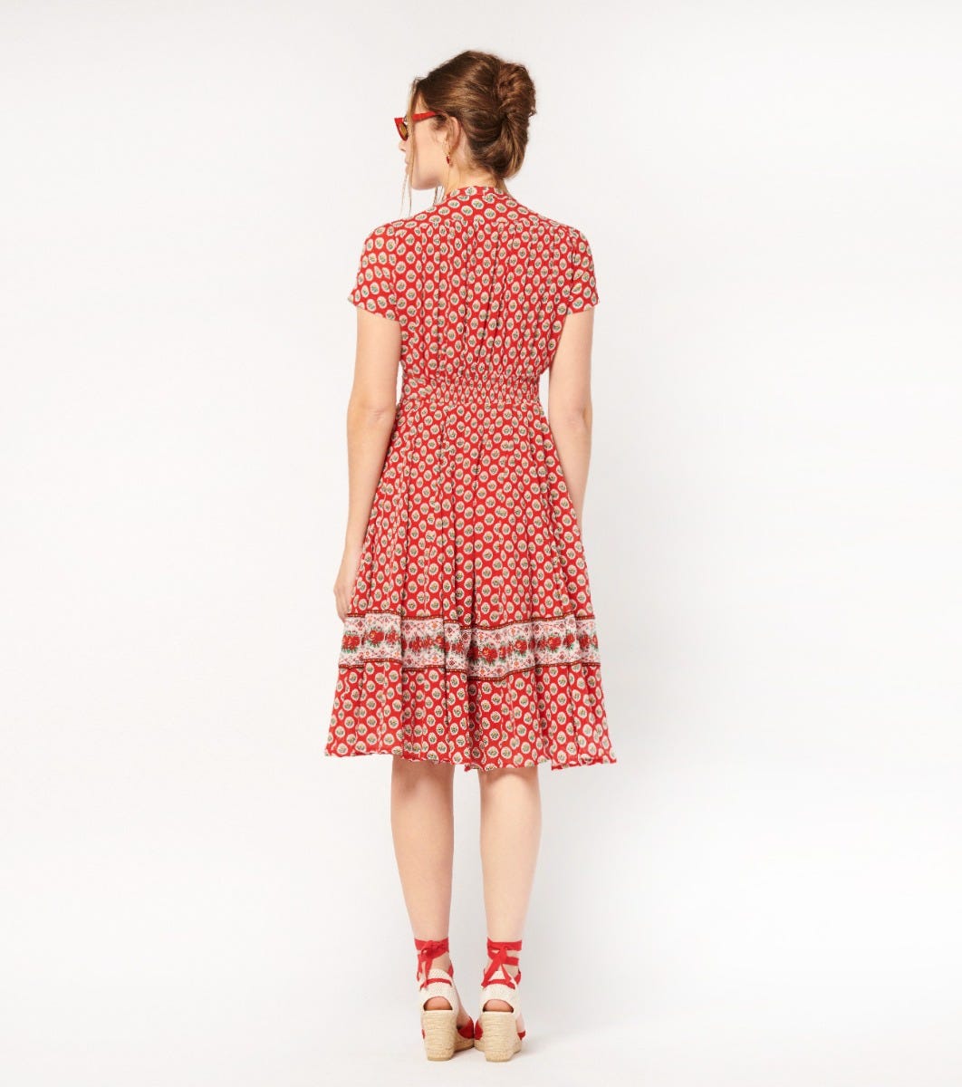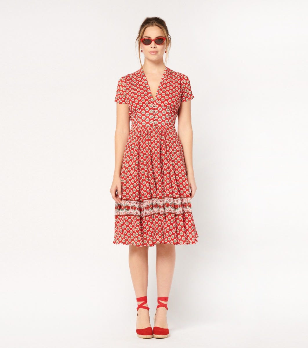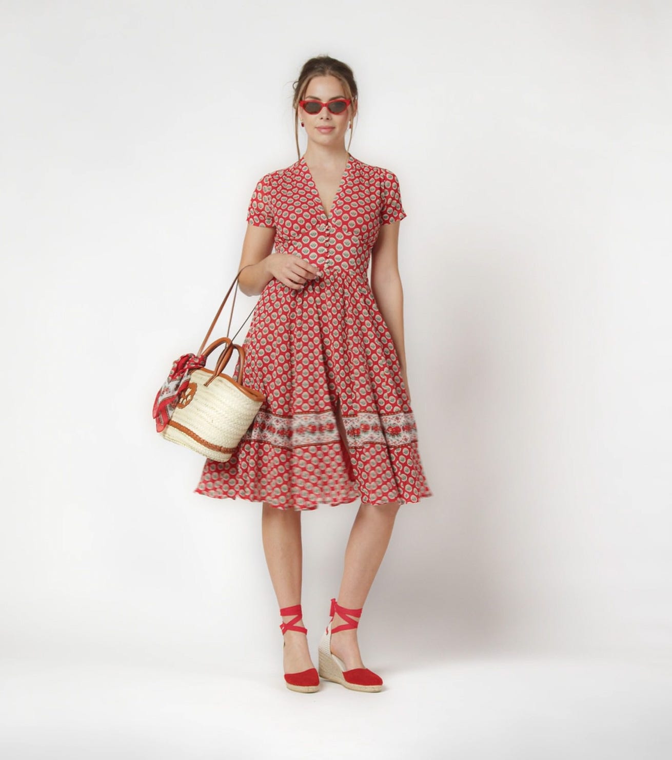 - Marilyn, printed cotton-silk crepe dress, cinched at the waist with a corselet cutout and a smock effect at the back for an elegant silhouette.