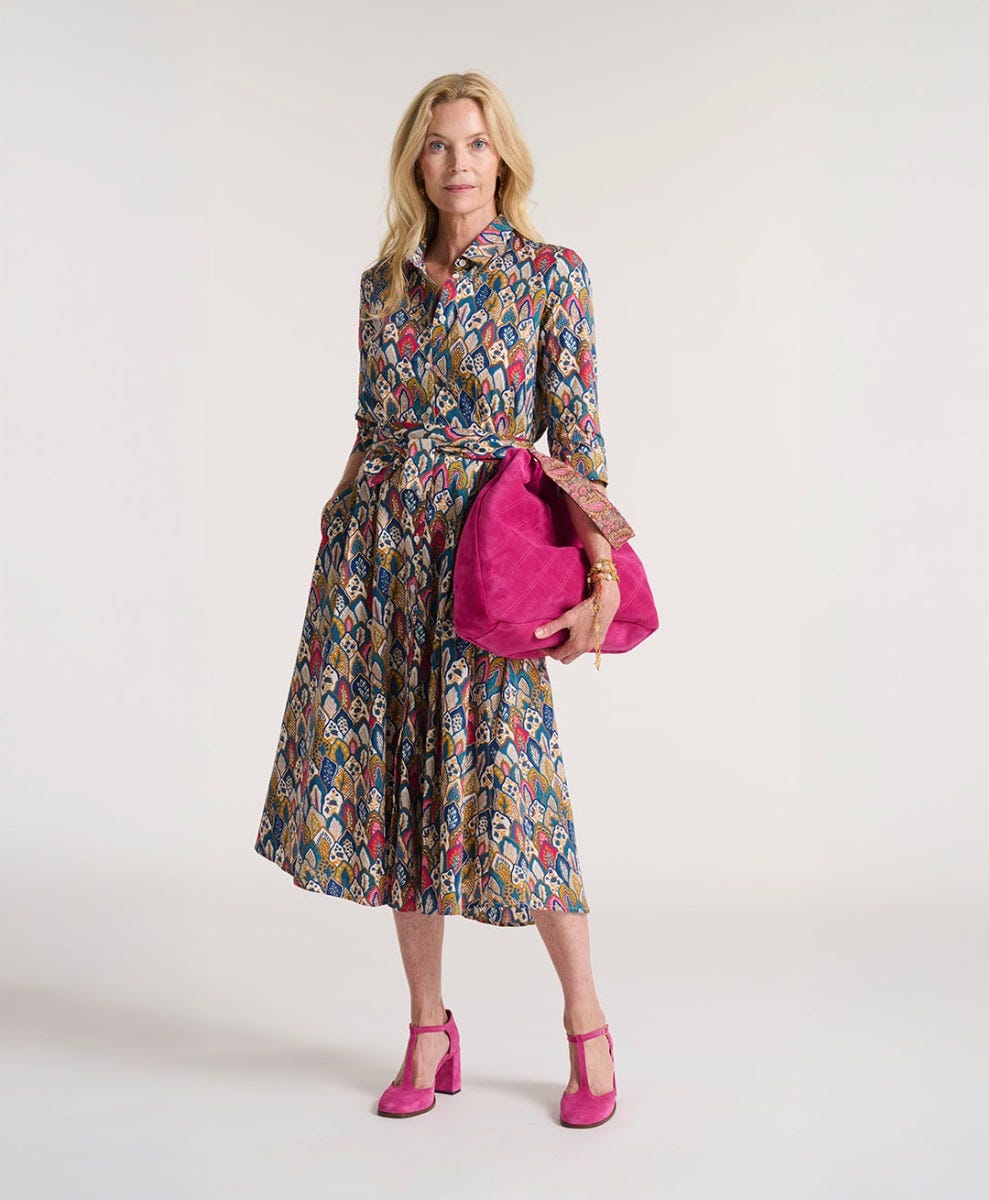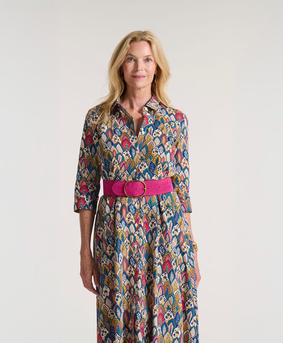 - This emblematic dress takes the codes of the men’s shirt and reinvents them in a feminine way. Its slim fit structures the silhouette with precision, while its removable belt lets you emphasise the waist as you wish. The delicate pleats reveal a subtly flared skirt, adding movement and lightness to the ensemble. An essential piece that’s both timeless and modern.