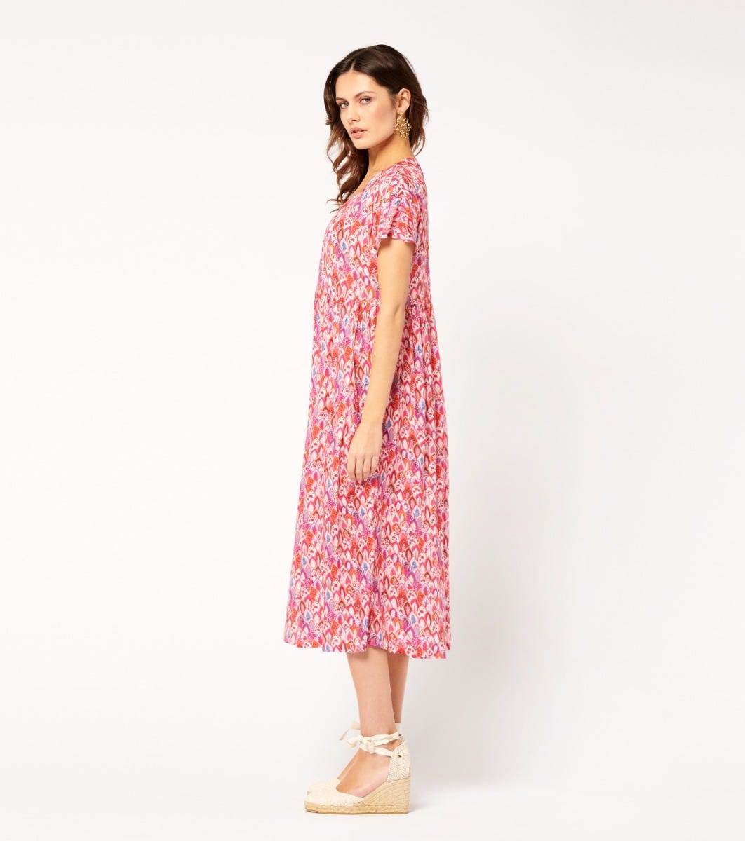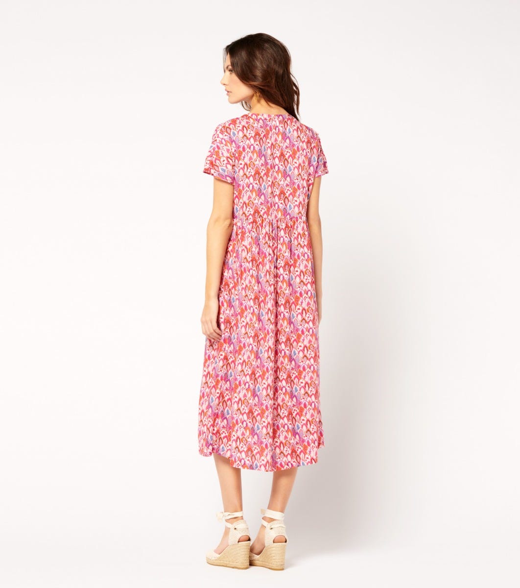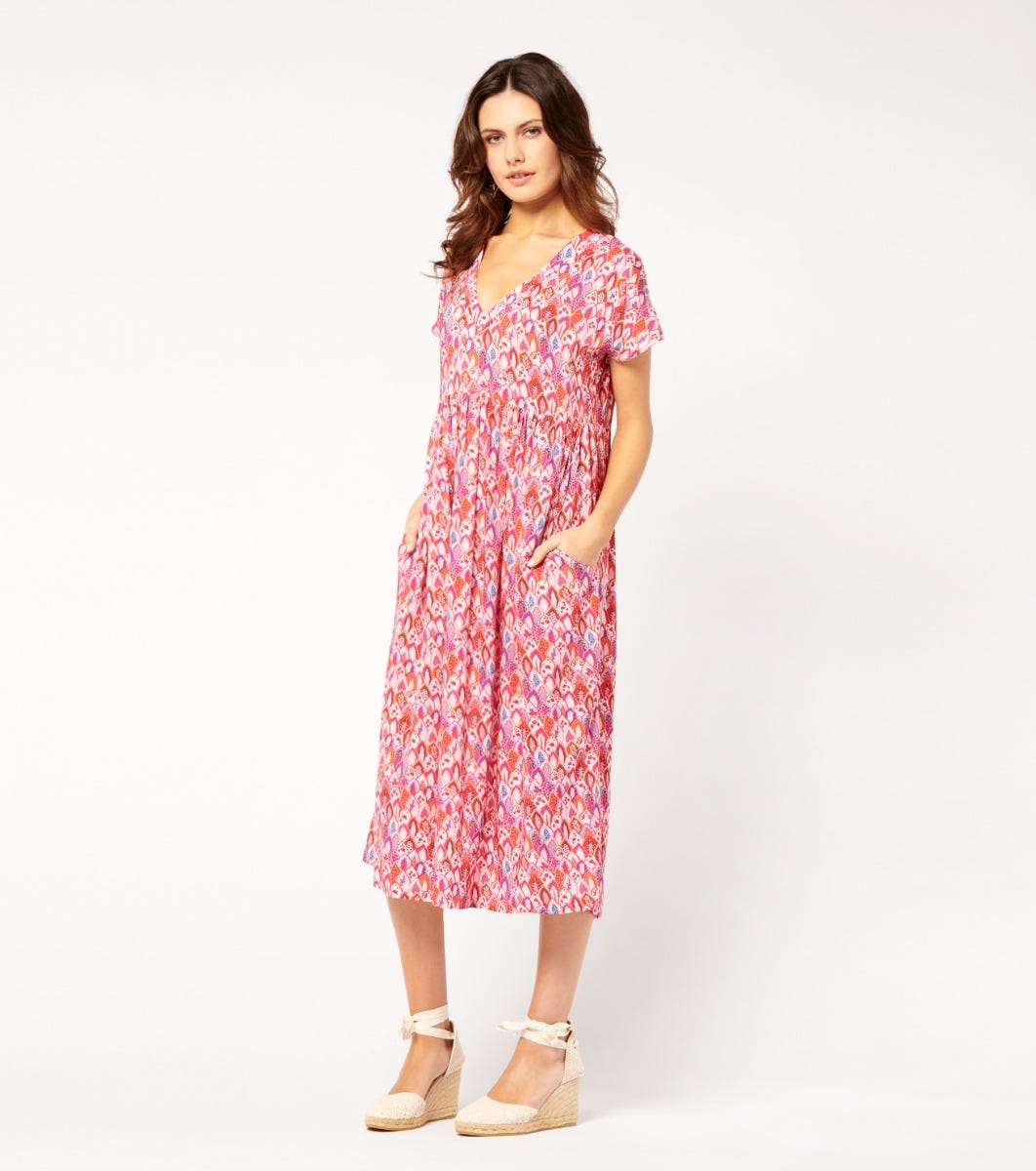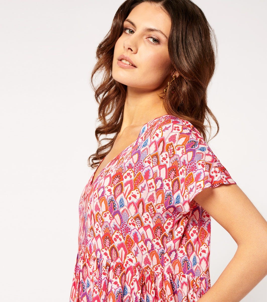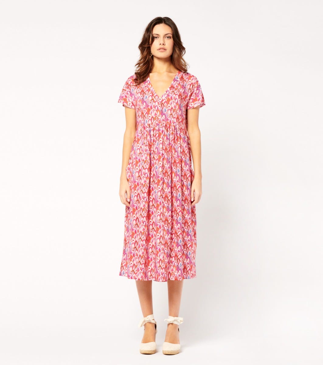 - Our iconic Jacqueline dress! A timeless cut with the season’s motif. Its scoop neckline and gathered waistline give it all its femininity. The fluidity of its fabric ensures a beautiful fall.