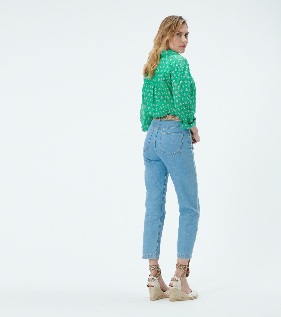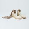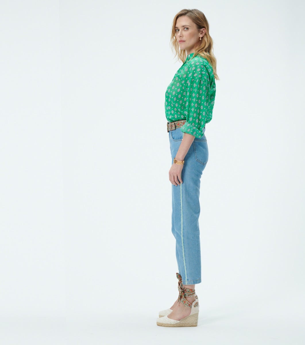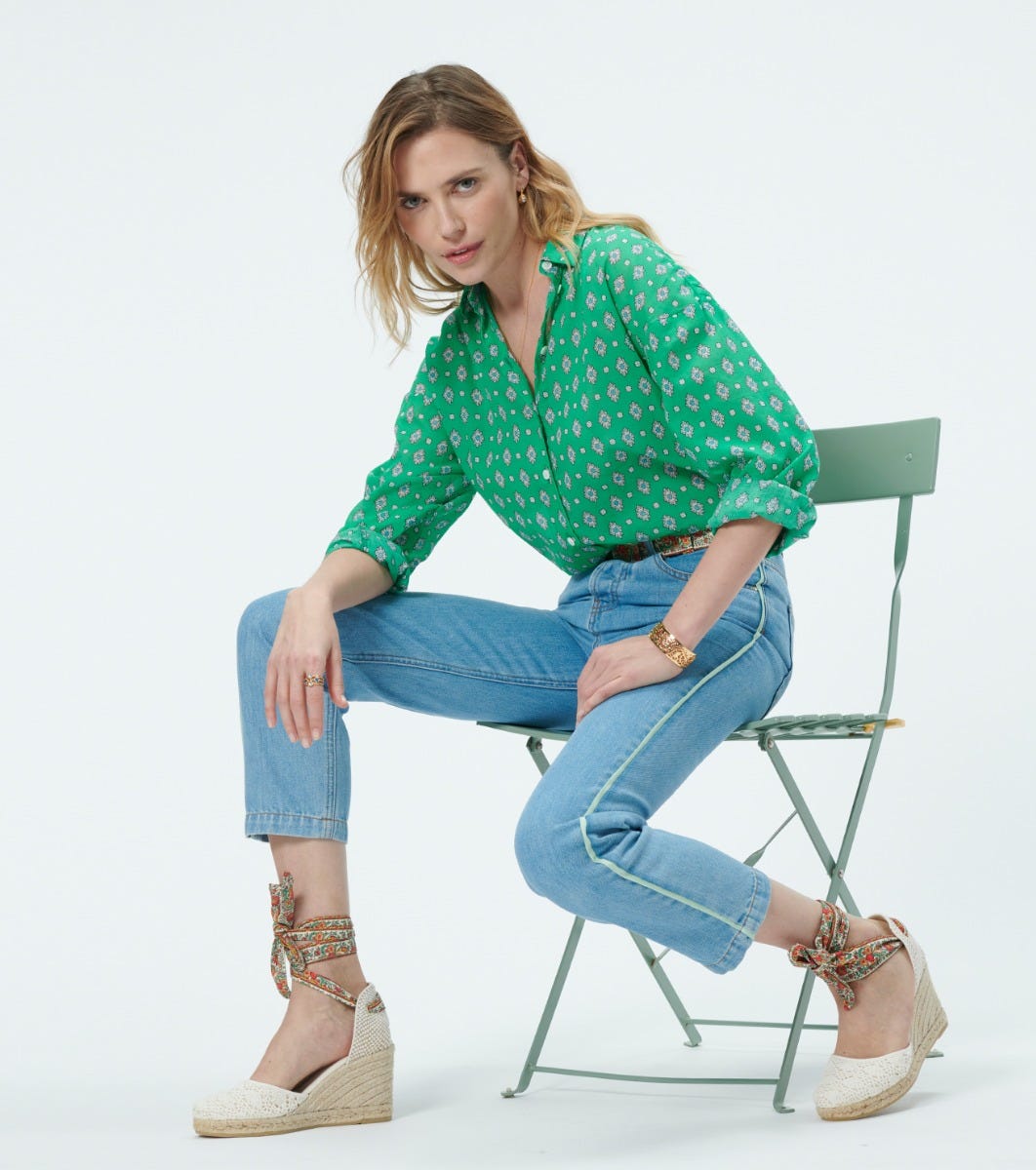 - Tied around the ankle with a “Frise Chardon nacre” braid-print cotton strap