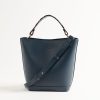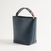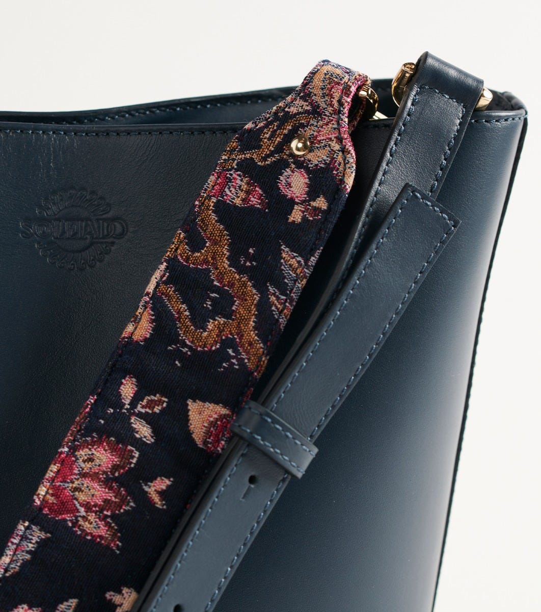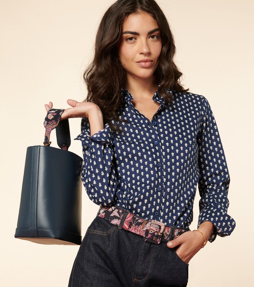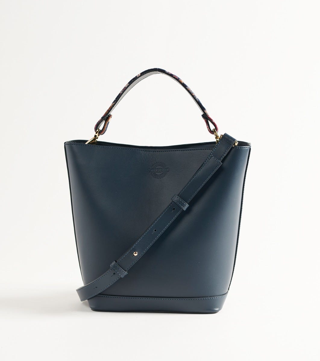 - Two-material bucket bag in navy leather and hand-carried handle sublimated by a jacquard in a fuchsia navy heron motif