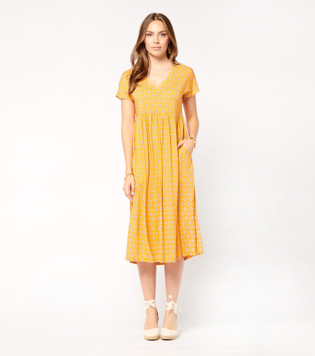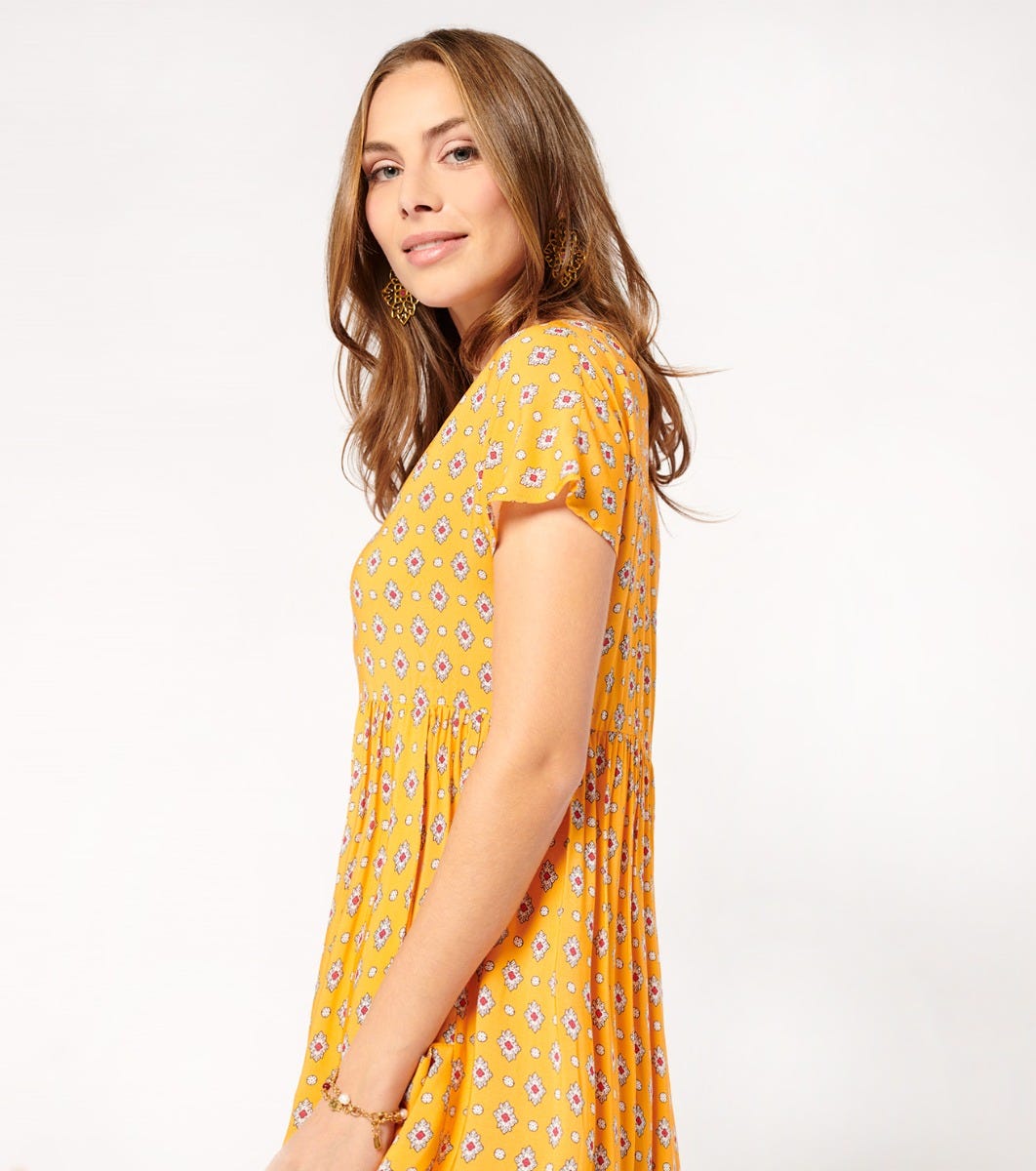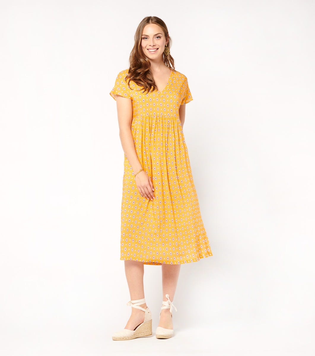 - Our iconic Jacqueline dress! A timeless cut with the pattern of the season. Its open neckline and cut-out ruffled waist brings her all her femininity. The fluidity of its material ensures a beautiful fall.