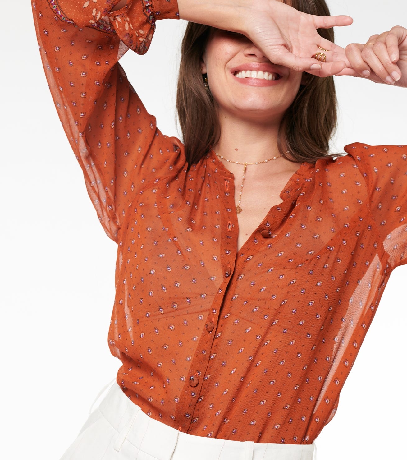 - Button placket in the middle front with delicate square buttons covered with fabric.
