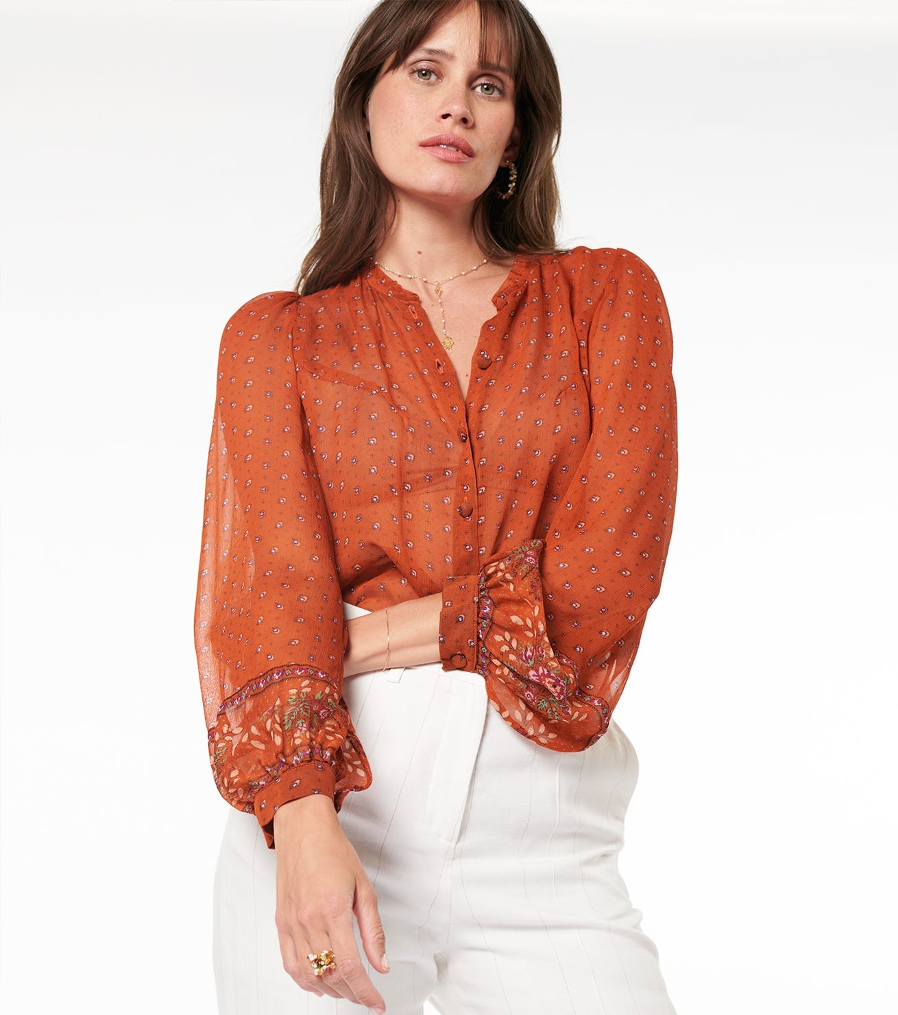 - Puffy sleeves tightened by a thin cuff, closed by a square button covered with fabric.