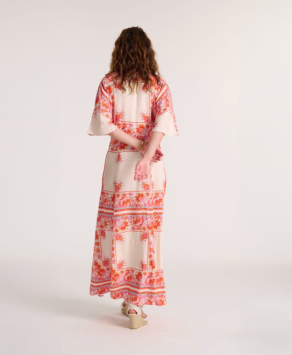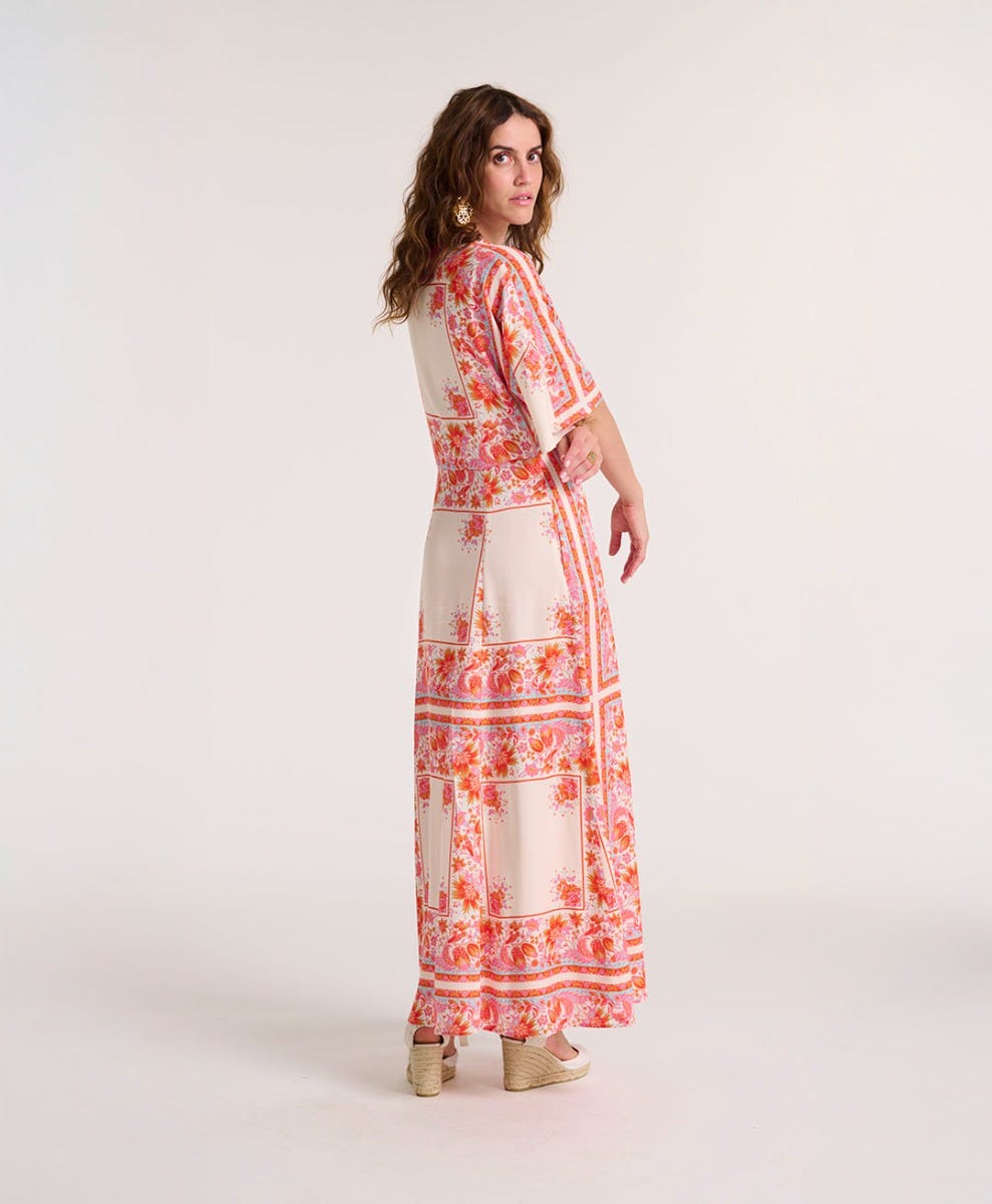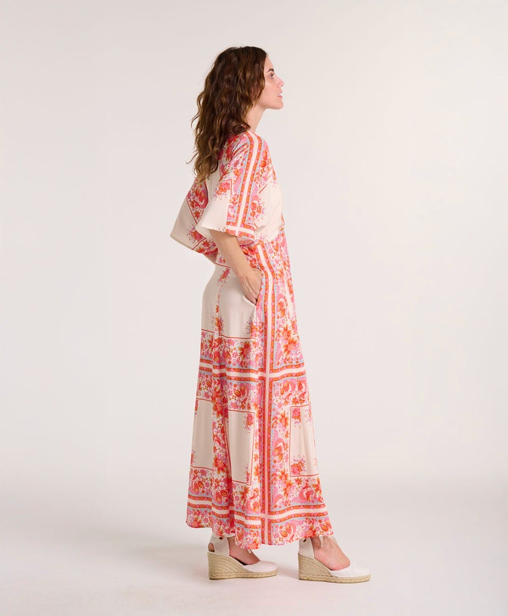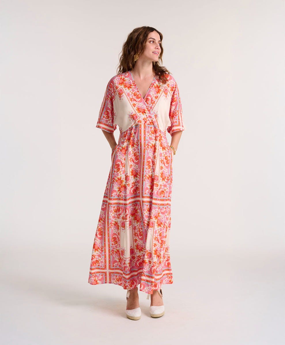 - A flowing dress that combines comfort and elegance. Its crossover neckline and kimono sleeves give it a feminine touch, while its side pockets add a practical, modern edge – a must-have for a trendy look. The placement of the scarf-effect print emphasizes the cut of this dress.