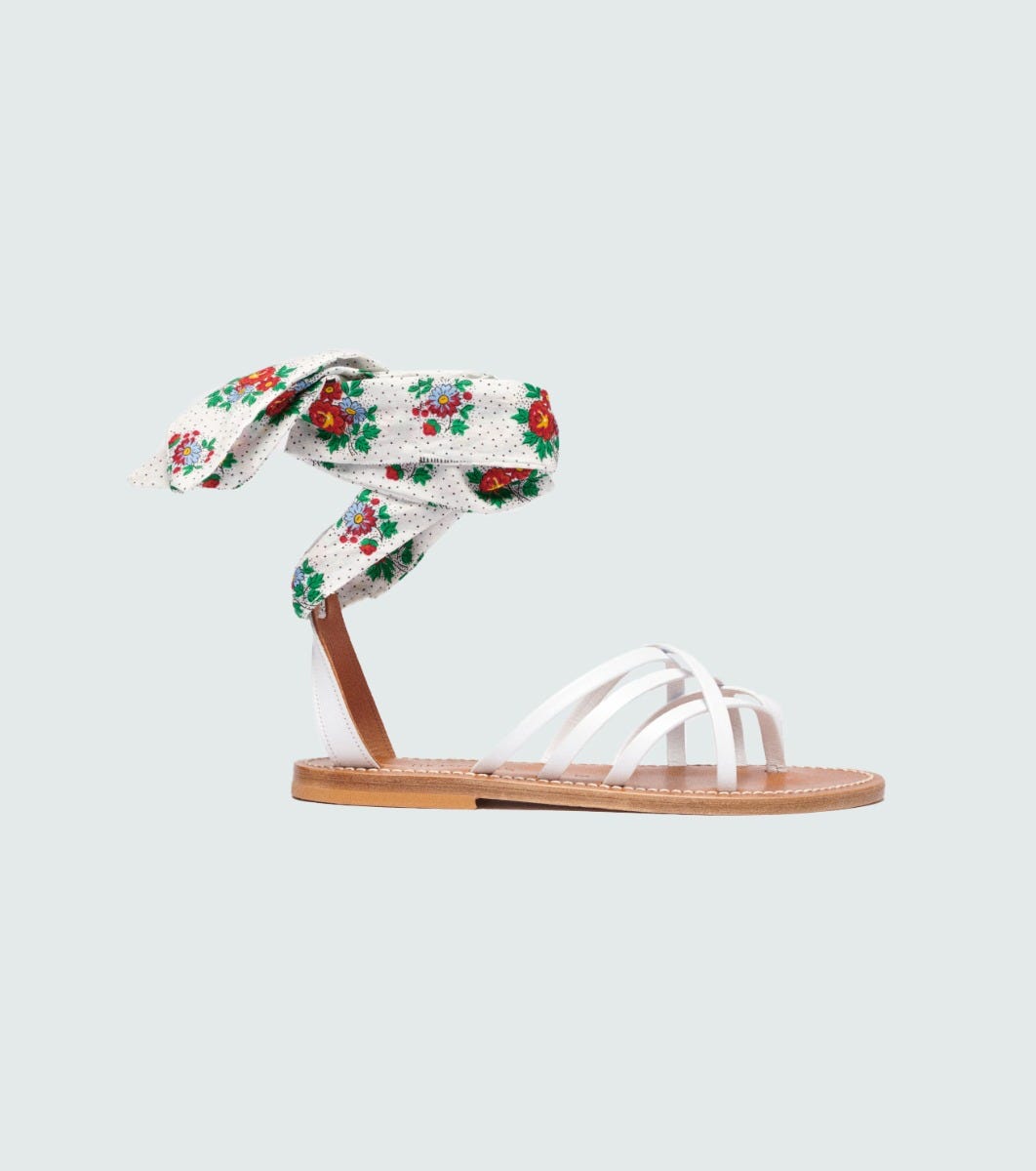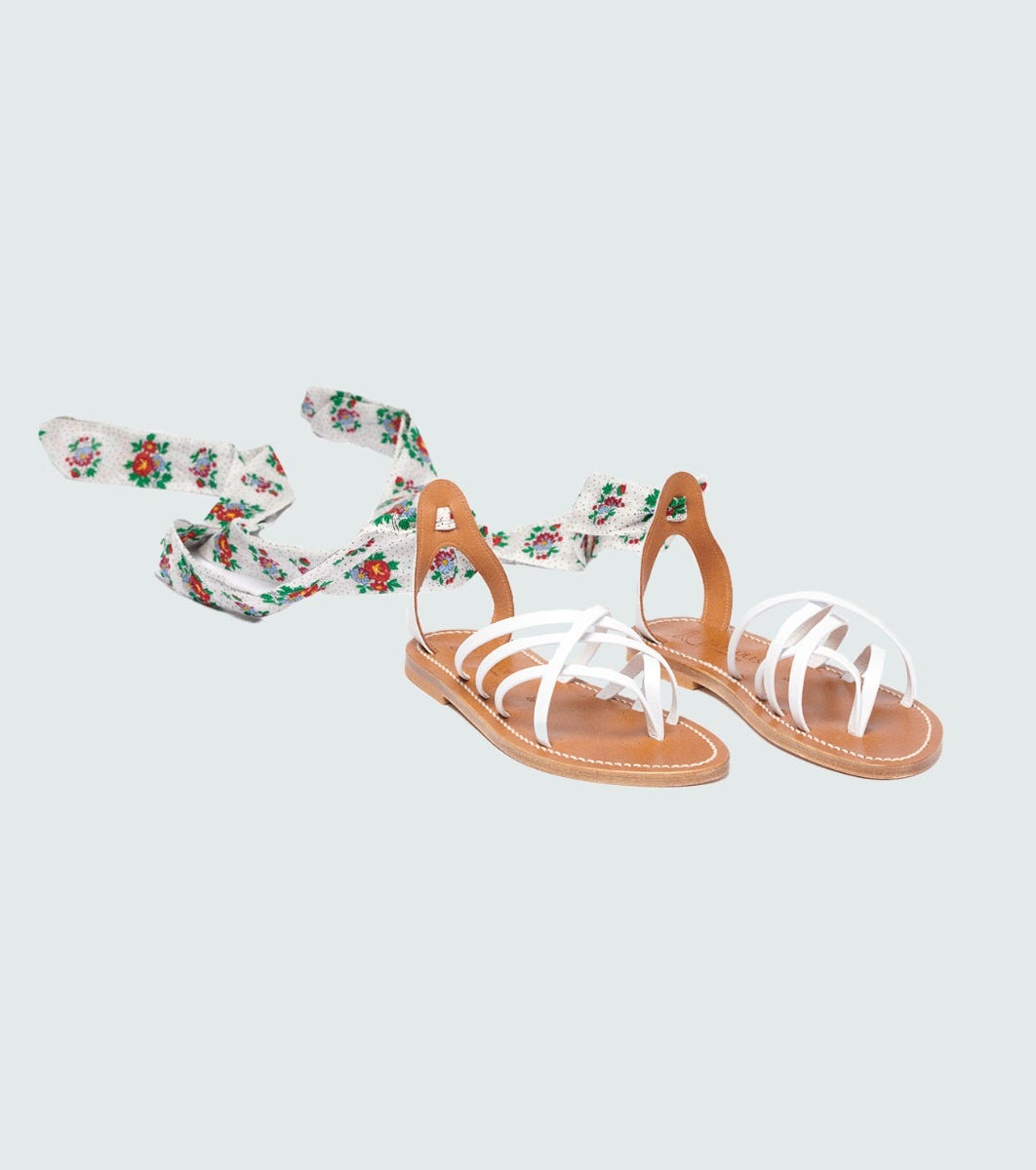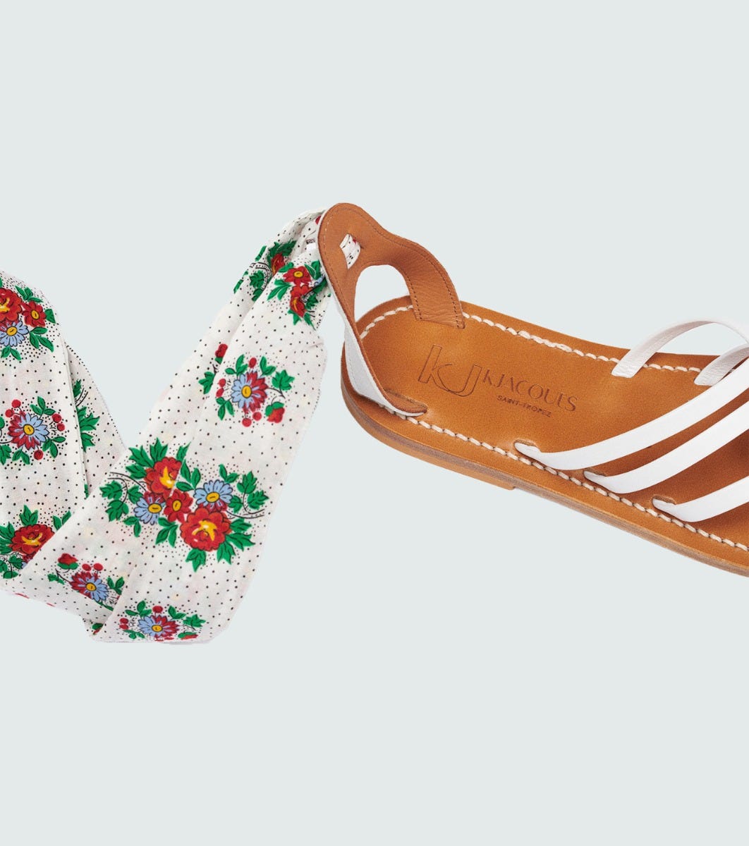 - Refined yet casual, the Laconie model in collaboration with K.Jacques is characterized by the play of crossover leather straps on the instep. Its crowfoot-shaped heel strap elegantly holds the heel in place and fastens securely to the foot with a Souleiado print ribbon to tie around the ankle.